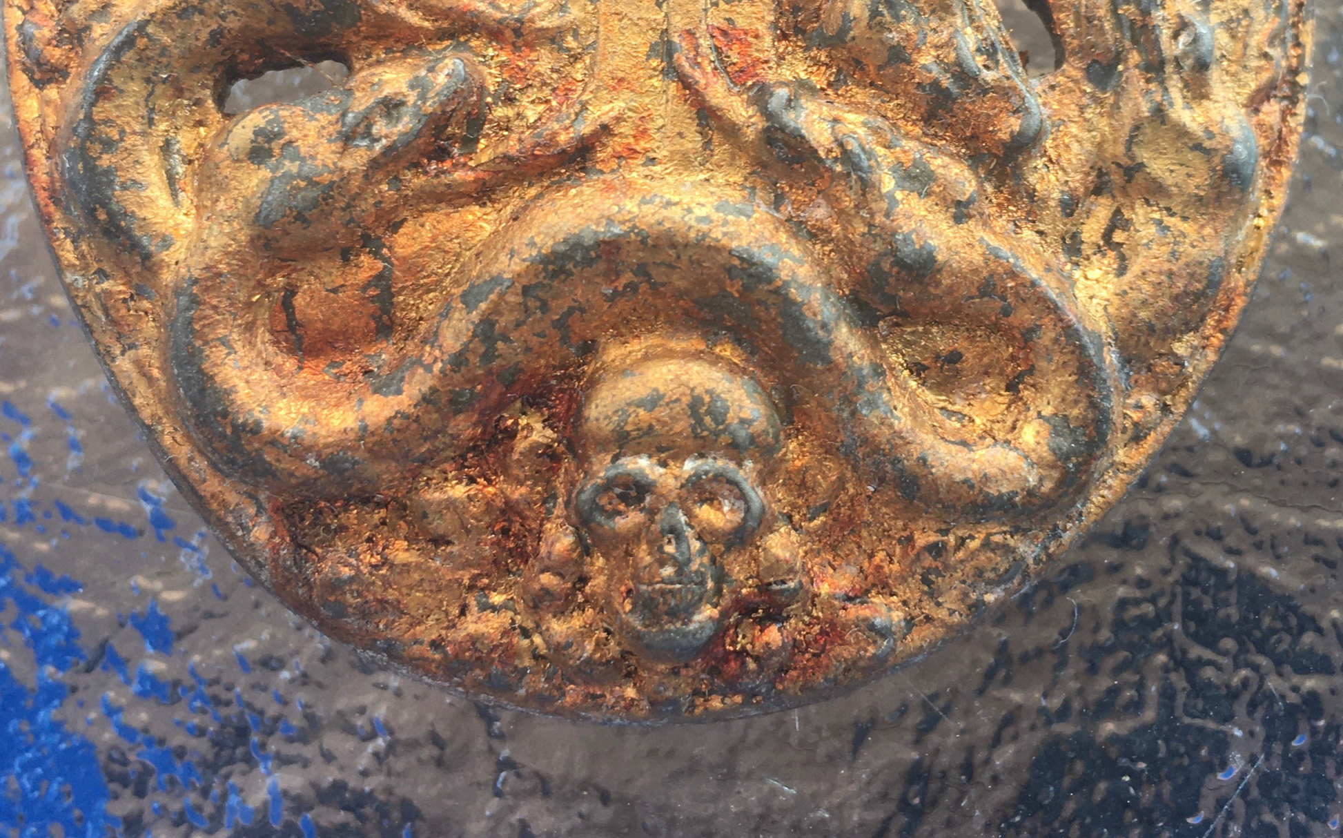 Despite the wear, the piece displays excellent detail throughout the wreath, sword, and serpent design, testifying to its authenticity and combat association. It weighs exactly 34.5 grams and remains in overall very fine condition.
