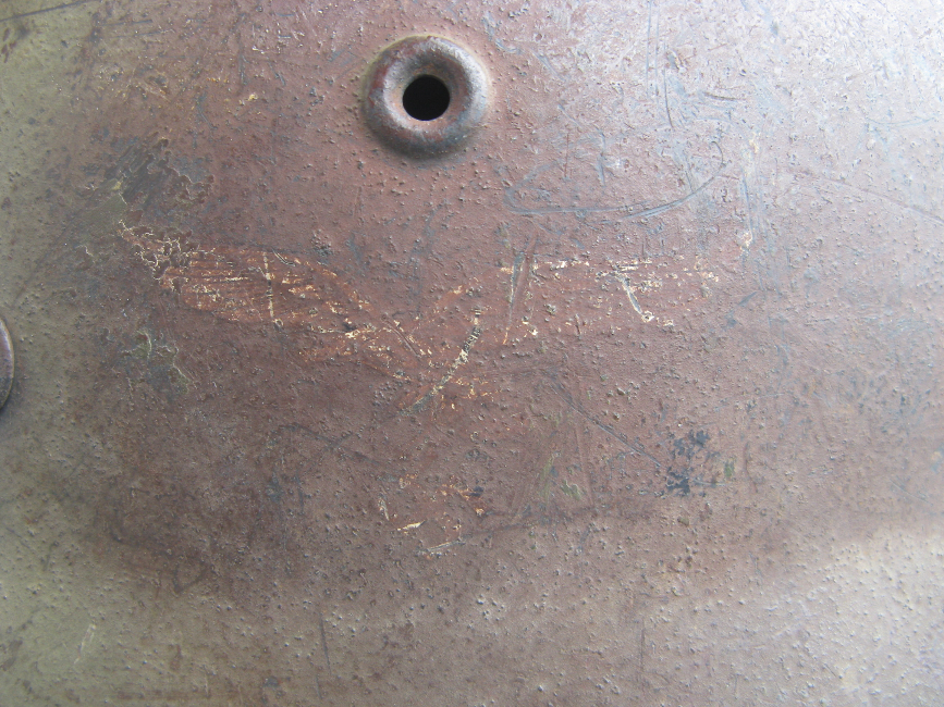 - Shell & Paint: Original blu-grau textured factory finish, later over-sprayed in typical field-applied camouflage. The “one-look” camo immediately signals wartime use, with a striking combination of mauve, brown, and lime green creating excellent in-the-field contrast.